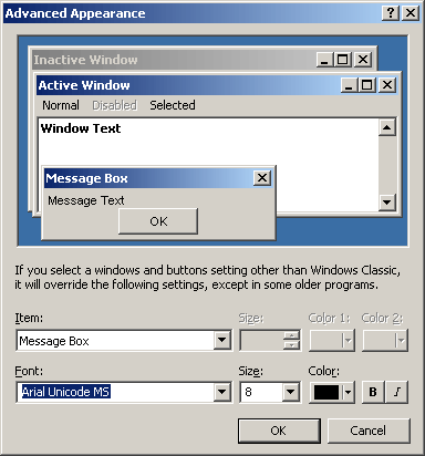 - Click on the button marked "Advanced". You will see an Advanced Appearance window like the one on the right.